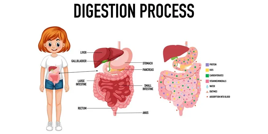 In simple terms, our digestive system is like a machine that takes the food we eat and turns it into energy for our bodies. The process starts in our mouth when we chew food, and it mixes with saliva. Then, the food goes down a tube called the esophagus to our stomach, where it’s broken down into smaller pieces.